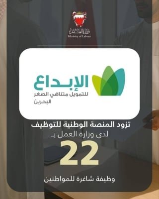 في إطار تنفيذ توجيهات صاحب السمو الملكي الأمير سلمان بن حمد آل خليفة ولي العهد رئيس مجلس الوزراء، بعرض 3 فرص وظيفية لكل باحث عن عمل مسجل لدى وزارة العمل، شركة الإبداع للتمويل متناهي الصغر تزود المنصة الوطنية للتوظيف بـ 22 وظيفة شاغرة للمواطنين.