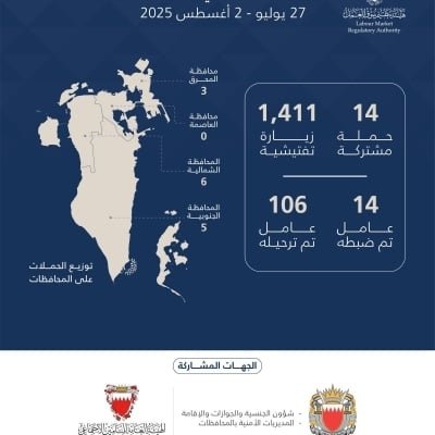 نفذت هيئة تنظيم سوق العمل 1,425 حملة وزيارة تفتيشية، خلال الفترة الممتدة من 27 يوليو إلى 2 أغسطس 2025، والتي أسفرت عن ضبط 14 عاملاً مخالفاً وغير نظامي، فيما بلغ عدد المرحلين خلال الفترة المذكورة 106 مخالفين.